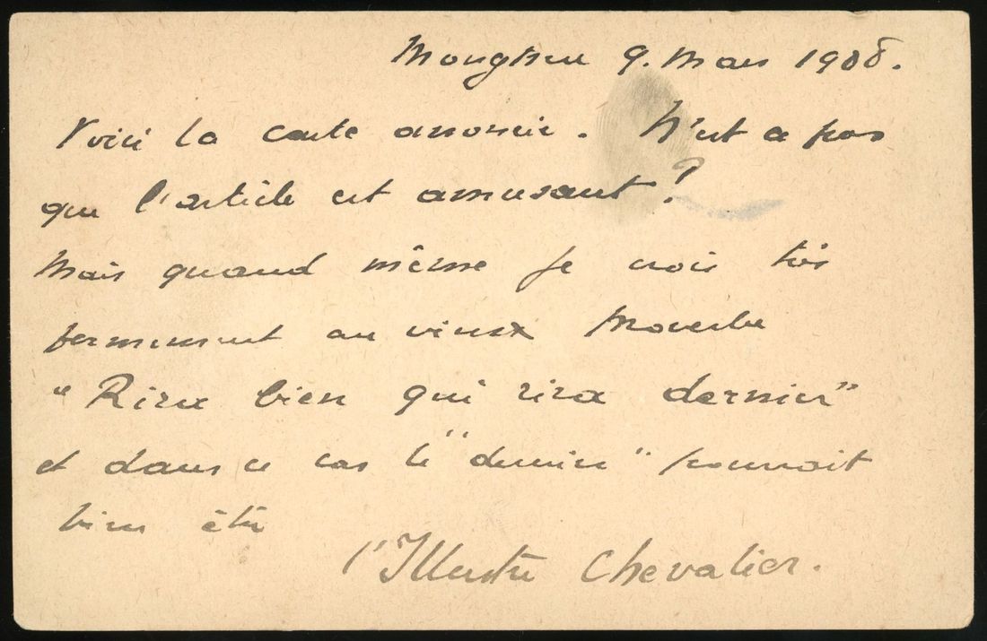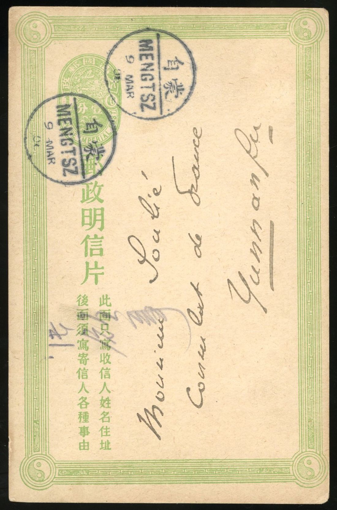 1908 (9 Mar) 1c card written from Mengtsz cancelled by Imperial Post Office Mengtsz c.d.s. to Yunnan-Fu. Very rare item of stationery card use from Yunnan Province.