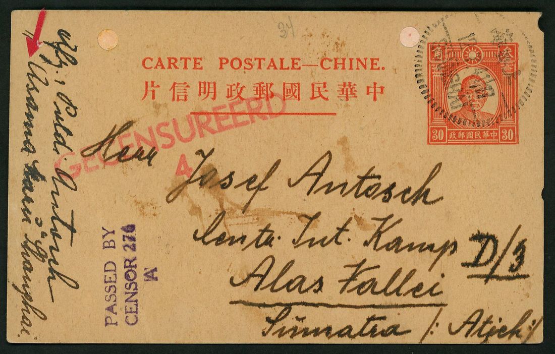 1941 (12Jul) 30c card to Sumatra routed via Singapore with 'Passed by Censor 276 A' in violet and Medan 'Gecensureerd 4' hand stamp in carmine. Ex Paul Bulterman's Prisoner of war collection and illustrated in his book 'Nederlands-Indie in Oorlog' page 28.