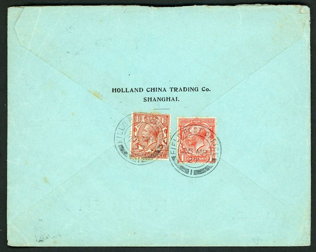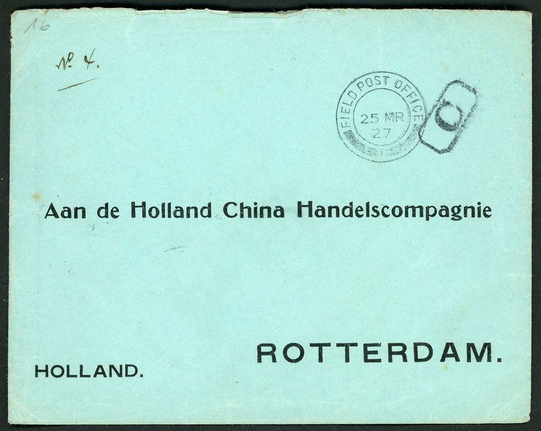 1927 (25 March) cover from Shanghai to to Holland on day of general post office strike so mail was sent through British military mail, bearing 1-1/2p and 1p on reverse tied by Field Post Office cance. Photo