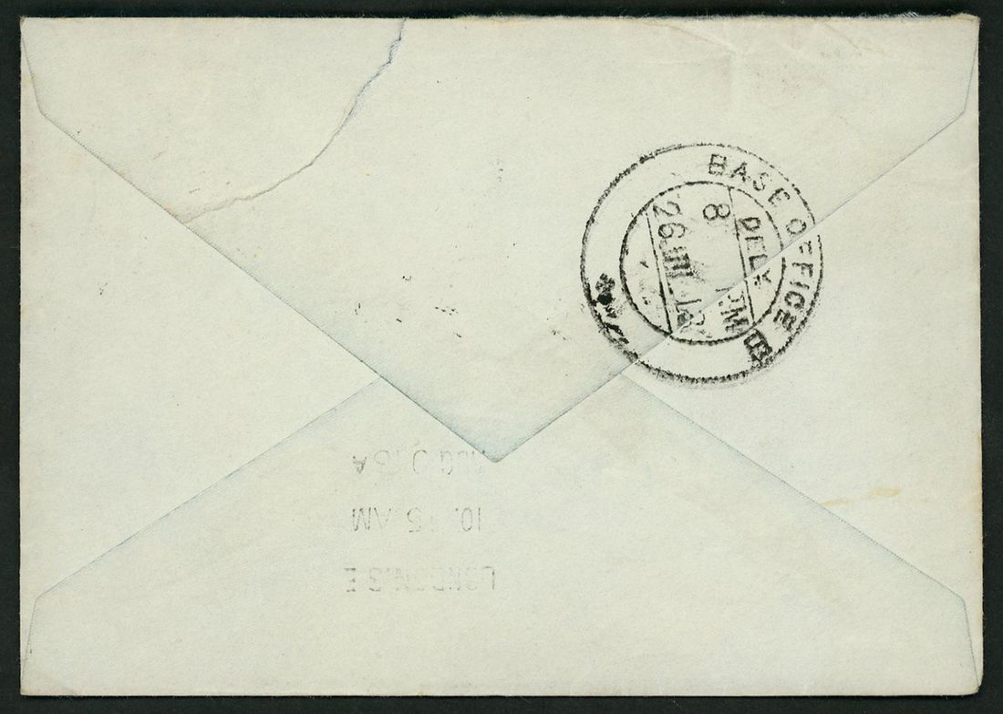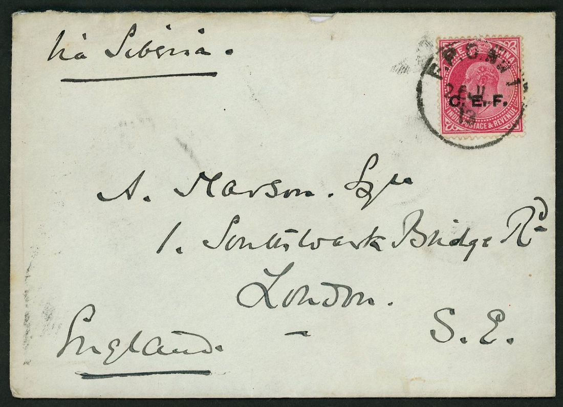 1913 envelope to London bearing overprint 'C.E.F. on 1a tied by 'F.P.O NO 1 26 JL 13'c.d.s. and with 'Base Office B DELY 8 P.M 26 JUL 13'c.d.s. Fine.