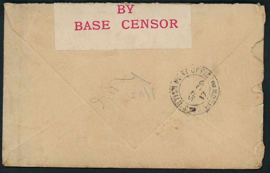 1917 stampless envelope written from France to Hankow cancelled by 'Army Post Office S.1926 JY 17' c.d.s. with 'Examined By Base Censor' label and oval 'Passed Field Censor 8492' with circular 'S' in red and 'British Post Office Hankow SP 20 17' on reverse.Very nice item of destination mail from the Western Front.