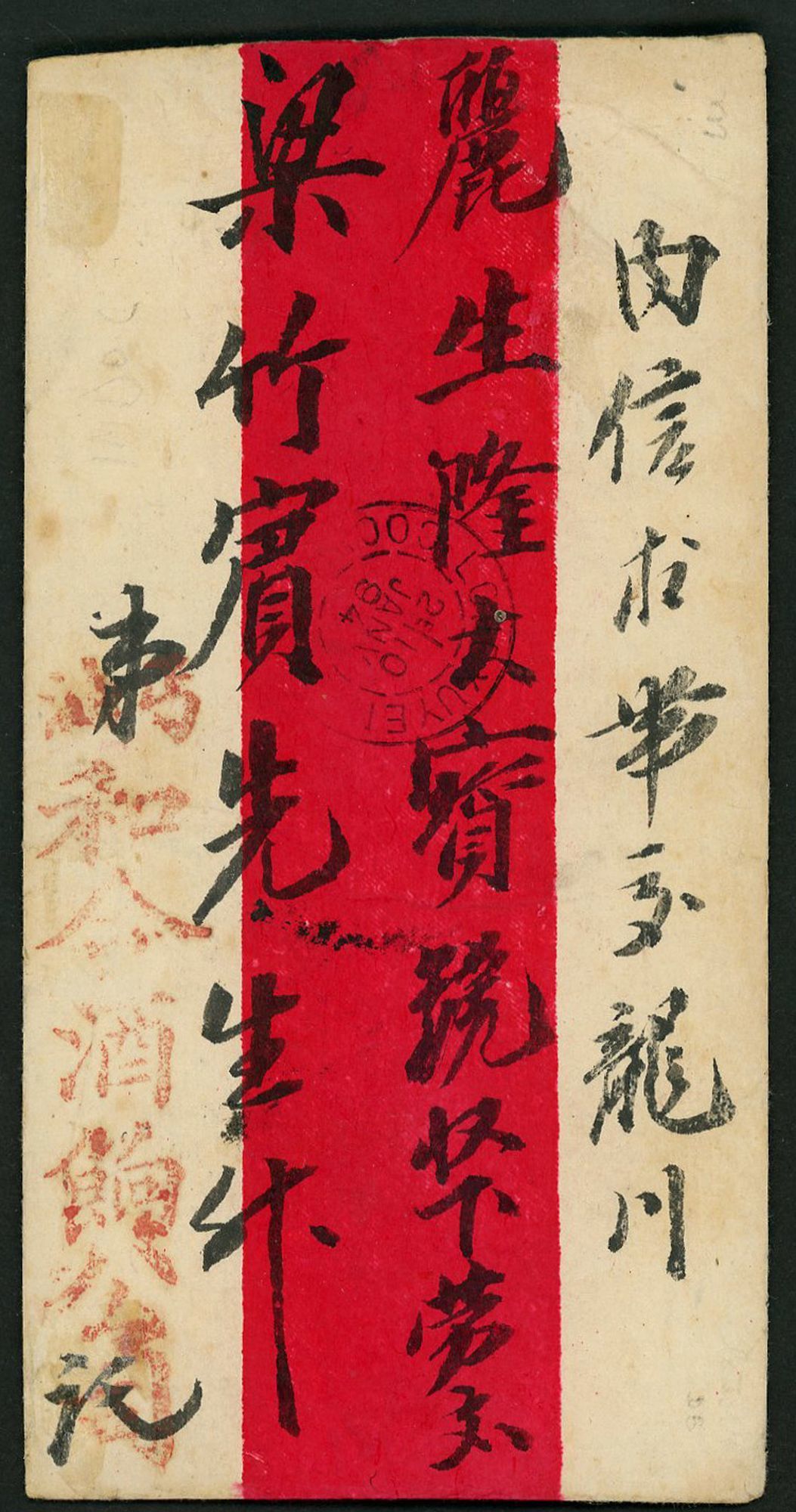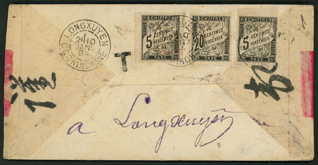 1894 stampless red band envelope to Longxuyen, Cochinchine bearing French General Colony postage due 5c x2 and 20c tied by Longxuyen Cochinchine double ring arrival '10 Jan 94. Very fine.
