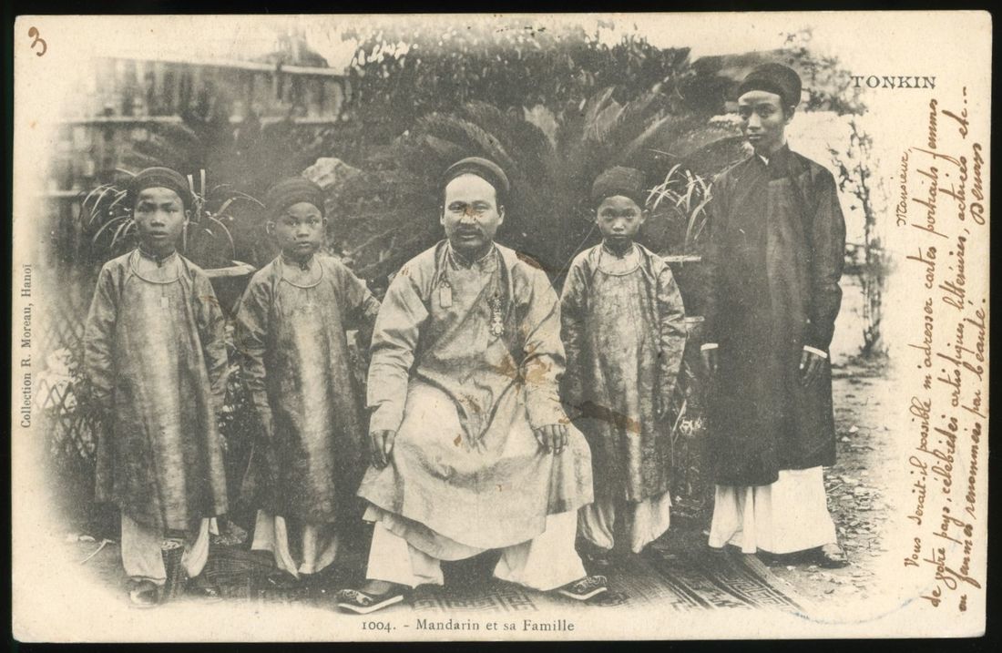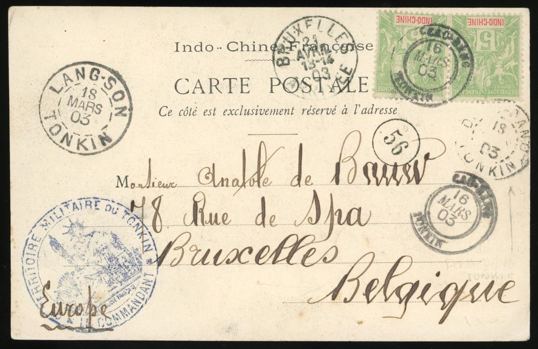 1903 picture postcard to Belgium bearing French Indo-China 5c x2 tied by Cao-bang/Tonkin c.d.s. dated '16 Mars 03' with circular 'Territoire Militaire du Tonkin/Le Commandant' in blue with Bruxelles arrival c.d.s.on face.Fine.