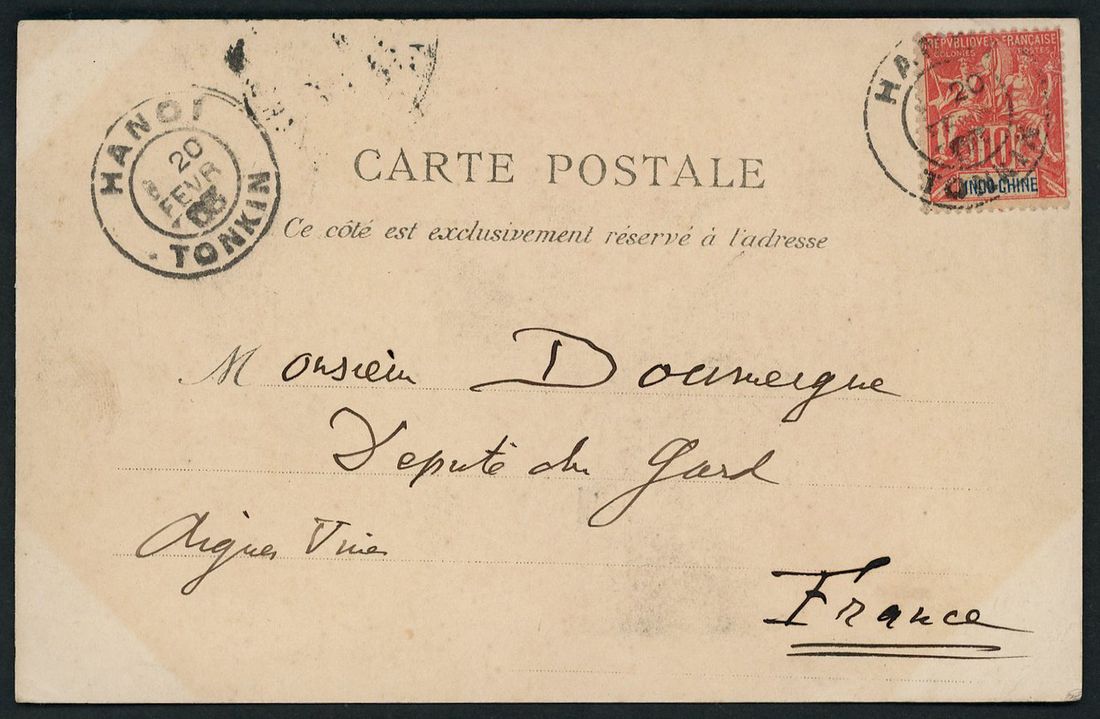 1903 picture postcard to France bearing Indo-Chine 10cts. tied by 'Hanoi/Tonkin 20 FEVR 03' double ring.Fine