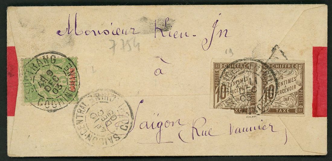 1903 red band cover to Saigon,Cochinchine bearing French Indo-China 5c tied by 'Soctrang Cochinchine 9 Dec 03' c.d.s. underpaid with framed triangular 'T' handstamp and bearing French General Colony postage due 10c imperf pair applied and tied on arrival by 'Saigon-Central' receiver 'Dec 10'.Very fine.