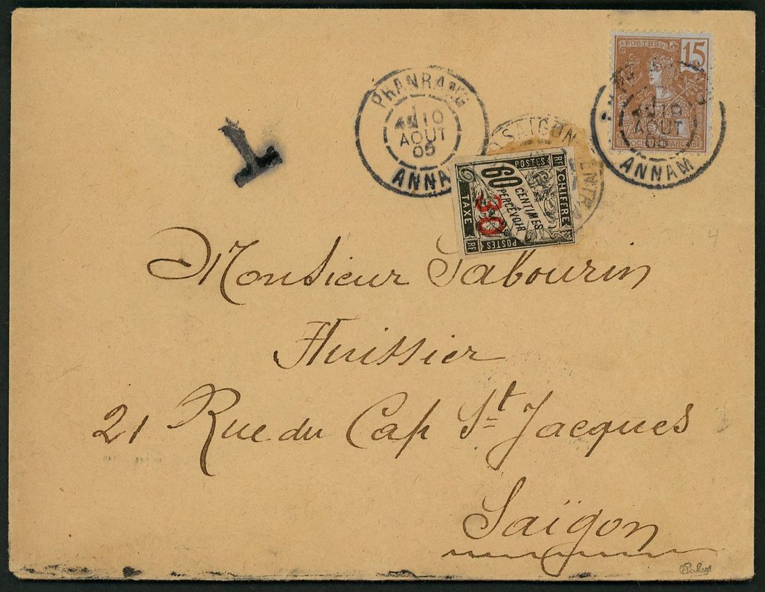 1905 envelope to Saigon bearing French Indo-China 15c tied by 'Phanrang Annam 10 Aout 05' c.d.s. underpaid with bold hand-struck 'T' and bearing French Indo-China postage due 30c on 60c imperf tied by 'Saigon Central Cochinchine' arrival '14 Aout 05' on reverse.Fine.