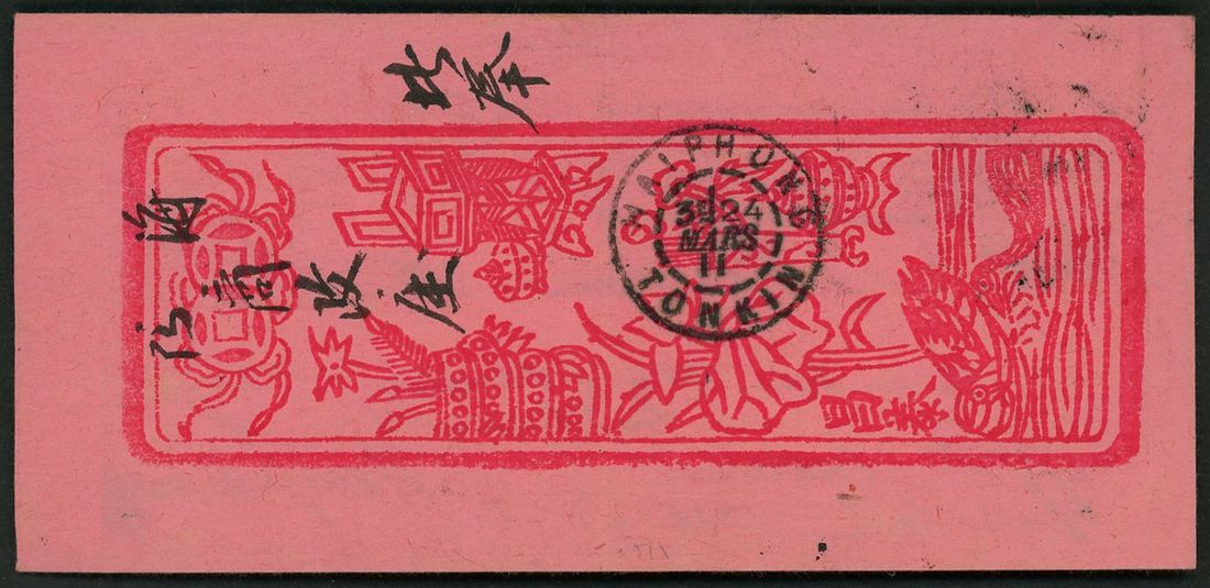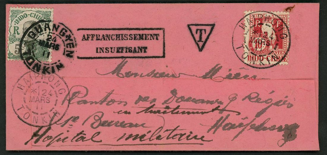 1911 envelope addressed to Haiphong bearing French Indo-China 5c and tied by 'Quangyen/Tonkin' double ring with triangular 'T' hand-stamp with framed 'Affranchissement Insuffisant' instructional on face and bearing French Indo-China postage due 10c tied by Haiphong/ Tonkin on face.Fine.