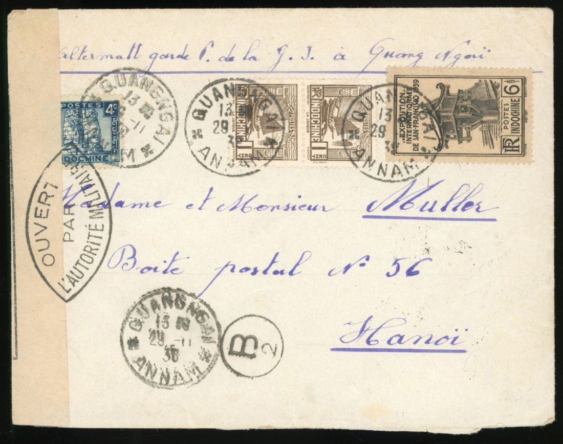 1938 envelope to Hanoi bearing Indo-China 1c in pair 4c and 6c tied by 'Quangngai/Annam' c.d.s. with 'Controle Postal Militaire' label and circular 'Controle Postal/Indochine,Commission B' in black and Hanoi arrival on reverse. Fine.