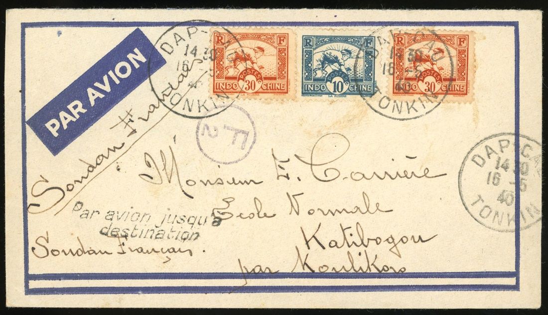 1940 (18 May) air mail envelope to Katibogou, French Sudan bearing French Indo-China 10c and 30 x2 tied by 'Dap-Cau/Tonkin' with instructional 'Par avion jusqu'a destination' on face ,routed via Hanoiand Koulikoro on reverse with circular 'F2' censor cachetapplied in Bamako.Fine.