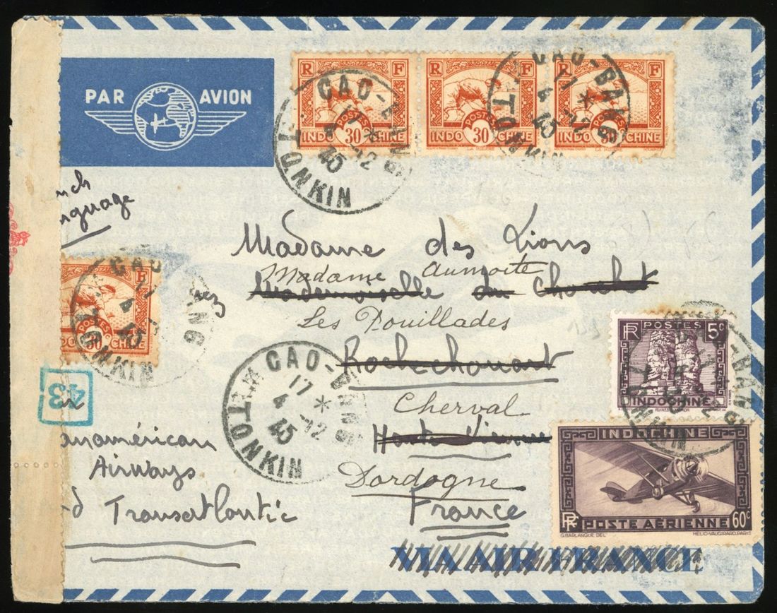 1940 (4 Dec) air mail envelope to France bearing French Indo-China 5c 30c x4 and 60c tied by 'Cao-Bang/Tonkin' c.d.s. routed via Hanoi and Hong Kong with 'Opened by Censor/Hong Kong' cesor label tied box '43' in blue and Dordogne arrival on reverse.Fine.