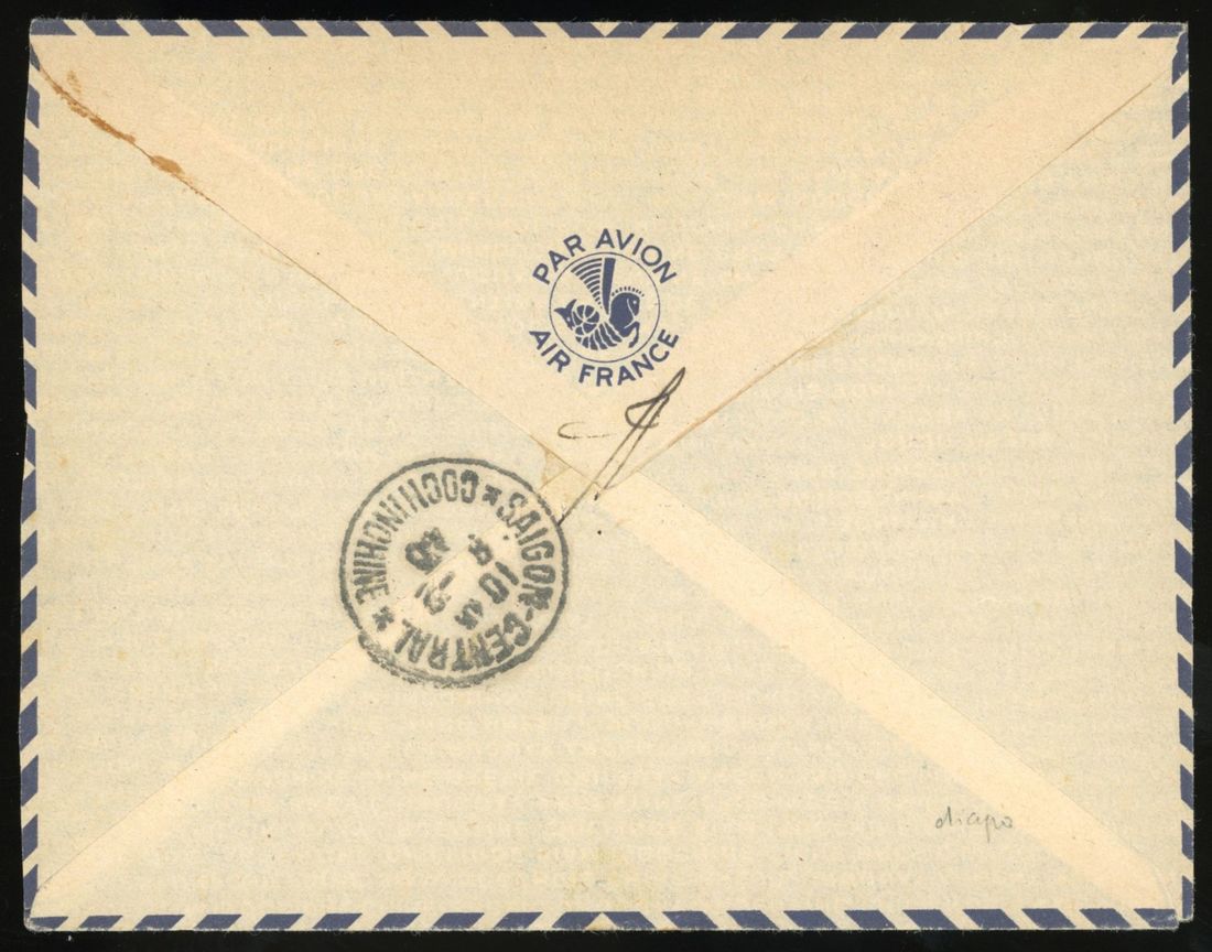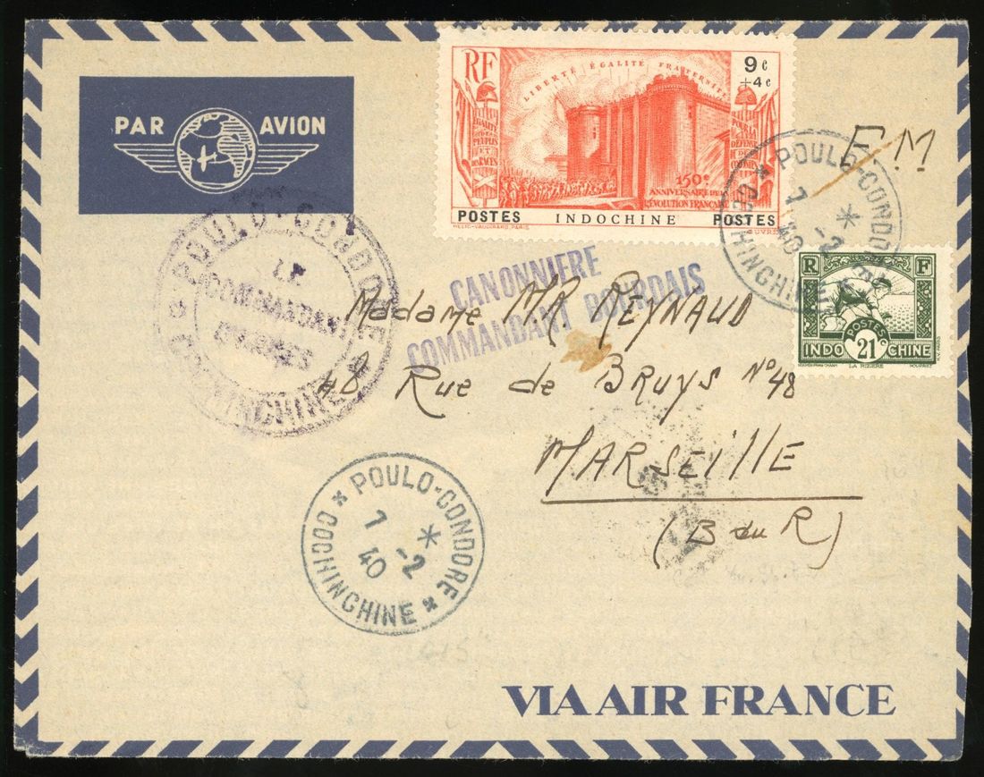 1940 (7 Feb) air mail envelope to France bearing 21c and 9c+4c tied by 'Poulo-Condore Cochinchine' with hand-struck 'Canonniere Commandant Bourdais' in violet and routed via Saigon.Attractive item of military mail.
