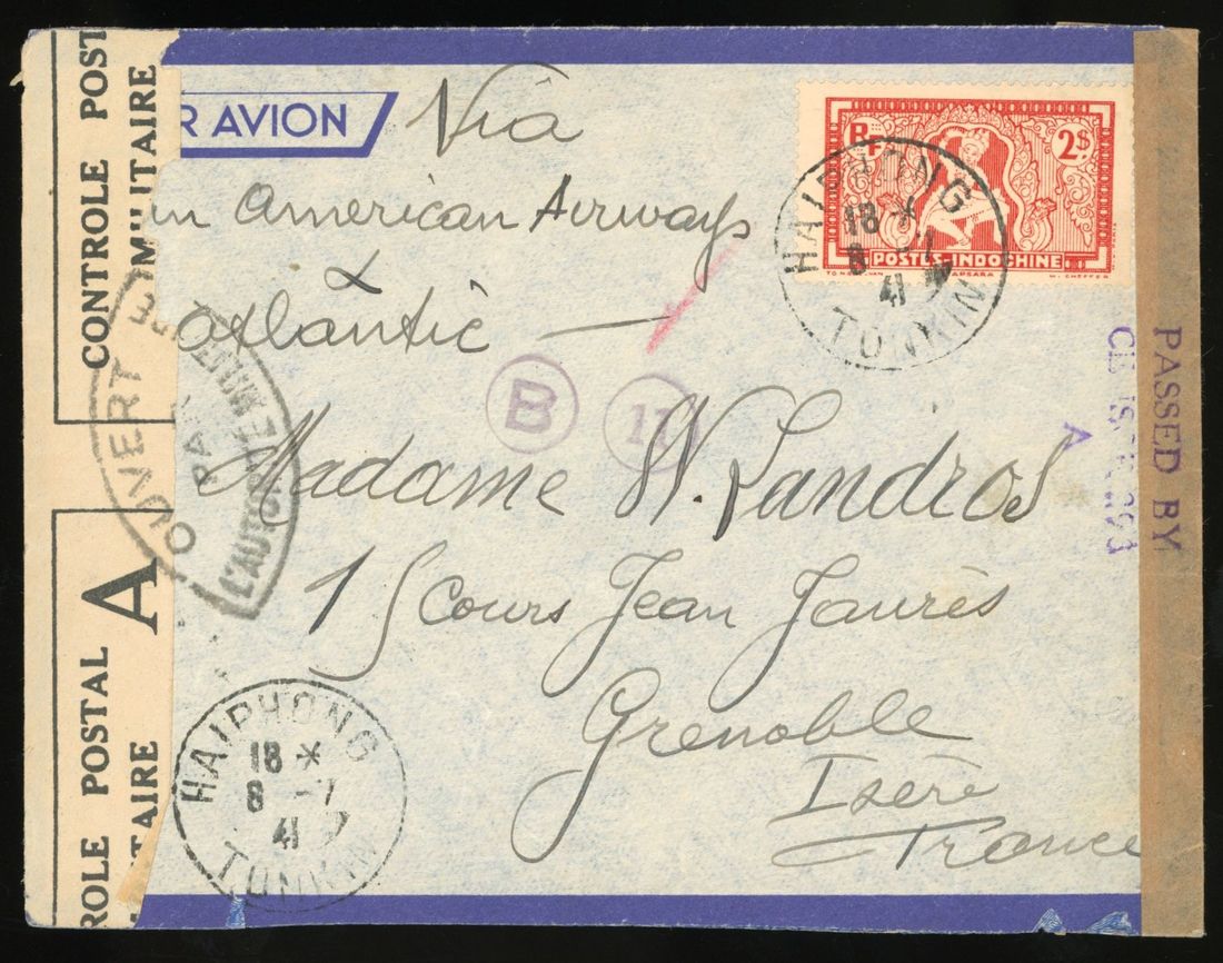 1941(8 Jul) air mail envelope to France bearing French Indo-China $2 tied by 'Haiphong/Tonkin'with 'Controle Postal Militaire' censor label tied by oval 'Ouvert Par L'Autorite Militaire' routed via Hanoi and Singapore with censor tape .Very Fine.