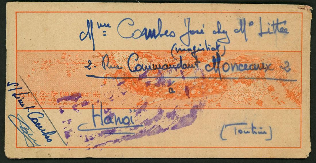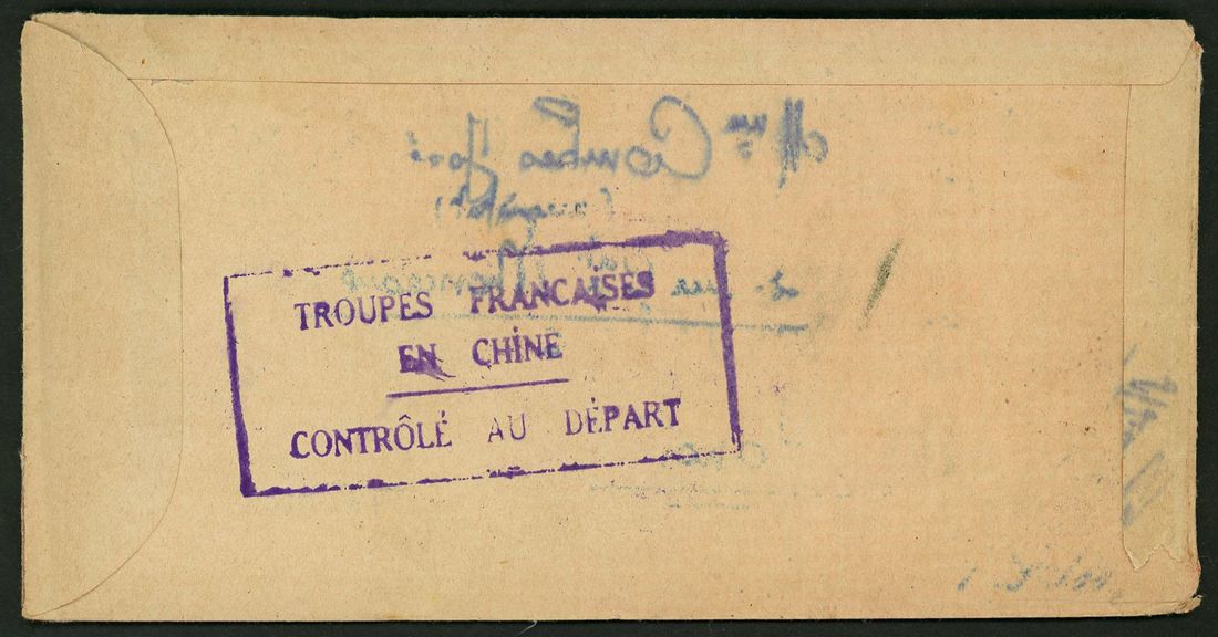 1945 stampless envelope to Hanoi,Tonkin written from China Shanghai with framed 'Troupes Francises En Chine Controle Au Depart' in voilet. The Shanghai French Concession in Shanghai,China from 1849 until 1943.The French troops did not move from the preserved French concession as the Vichy Government considered itself Neutral. Towards the end of the war the city was liberated from the Japanese and the Troops left for home at the end of 1945. This rare censor only found on the reverse of military mail is scarce with a few known items.Fine.
