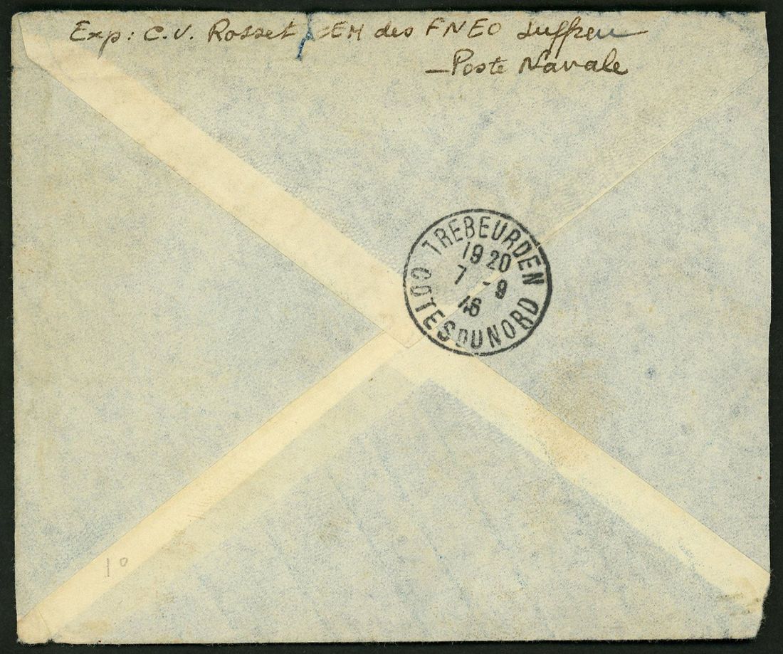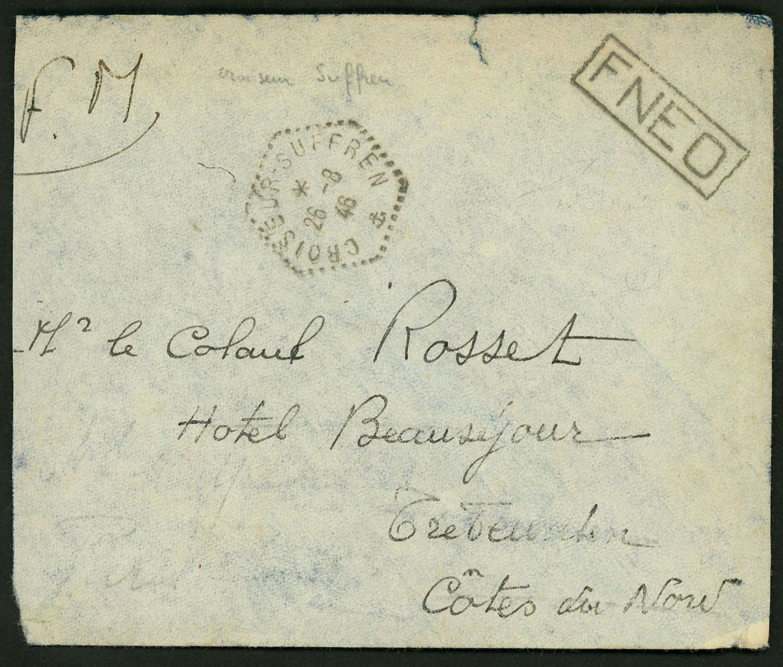 1946 stampless envelope to France wtitten from the French cruiser 'Suffren' cancelled by octagonal 'Croiseur Suffren 26-8 46' with framed 'FNEO' (Forces Naval Extreme Orient) and Trebeurden arrival on reverse.Fine.