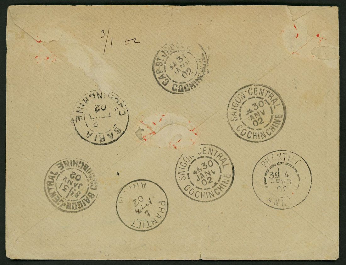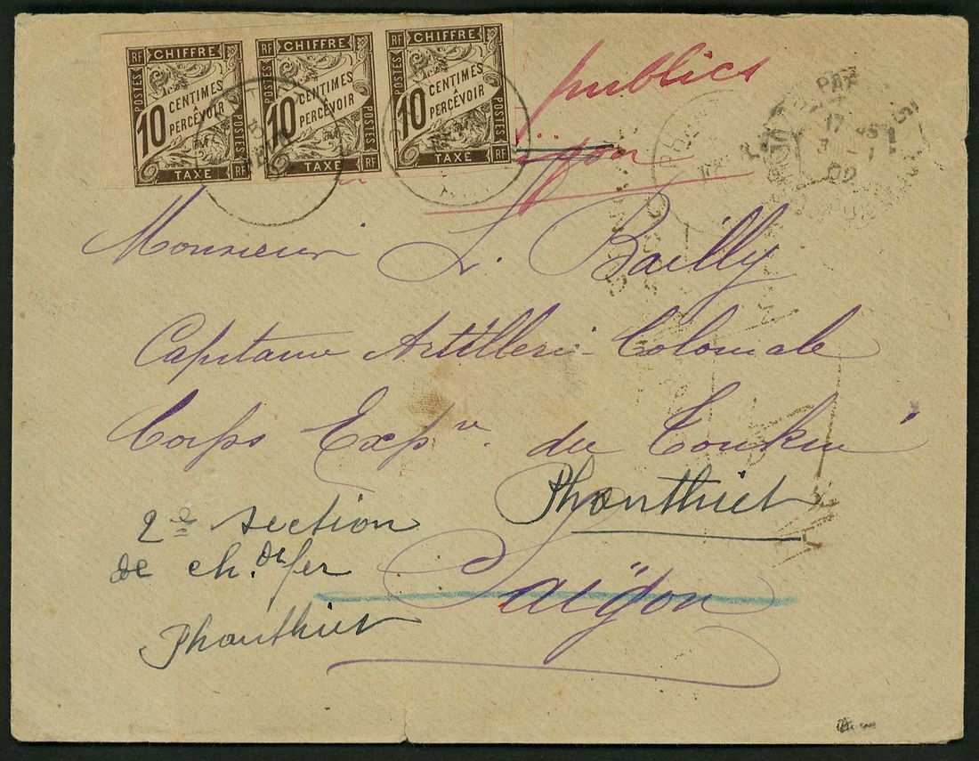 1902 Postage Dues envelope addressed to Sigon,Tonkin Saigon cancelled by Pairs dispatch '3 Jan02' with arrival inSaigon-Central '30Jan 02' and forwarded via Baria '2 Feb 02' to Phantiet/Annam where French General Colony postage due 10cts (imperf strip of three) applied and tied by Phantiet '4 Feb 02'c.d.s.. Very fine.