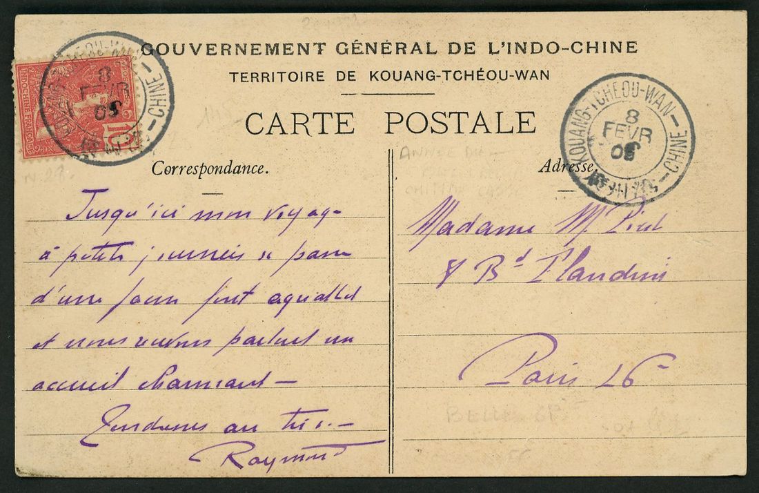 1905 (8 Feb) picture postcard to France bearingFrench Indo-China 10cts tied by 'Kouang-Tcheou-Wan -Chine' double ring c.d.s.Ex Desrousseaux.