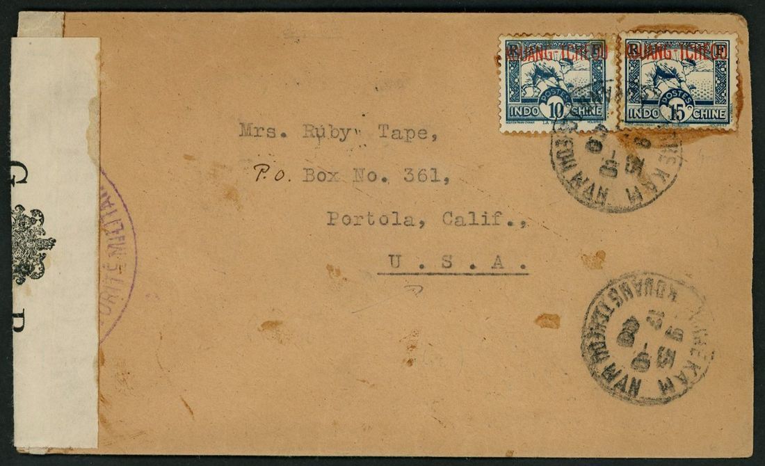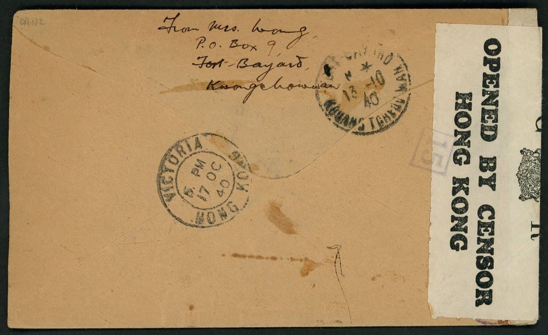 1940 envelope to the United States bearing Kouang-Tcheou 10c and 15c tied by 'Tchekam Kouang Tcheou Wan 12 Oct 40' routed via 'Fort Bayard 13 Oct 40 Kouang Tcheou Wan' and Hong Kong with 'G.R. Open by Censor Hong Kong' tied by boxed '15' in violet and 'Victoria 17 Oc 40 Hong Kong' on reverse. Good item of WW2 mail from the French Territory of Kouang Tcheou Wan.