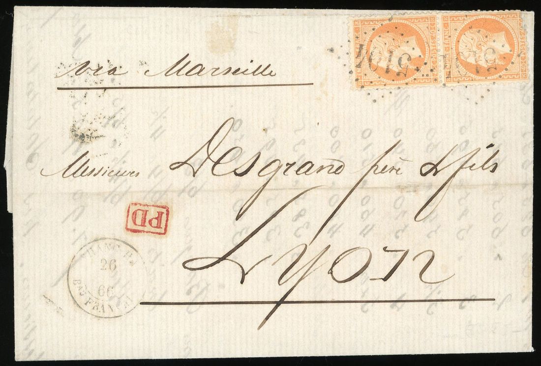1866 (26 November) entire letter from Shanghai to Lyon bearing Napoleon 40cts pair tied by French "5104" chop "via Marseille" with red "PD" handstamp. The transit from Shanghai to Hong Kong was done privately via the "Behar" and "Bengal", "Marseille a Lyon/13 Jan" and Lyon arrival (14 January). Photo
