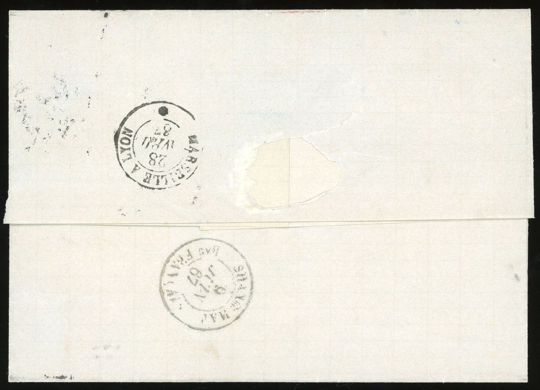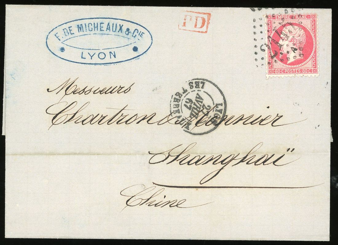 1867 (27 April) entire letter from Lyon to Shanghai bearing Napoleon 80cts tied by "2145" chop with red "PD" handstamp, on reverse "Marseille A Lyon/28 April" and French Post Shanghai arrival (9 June). Photo