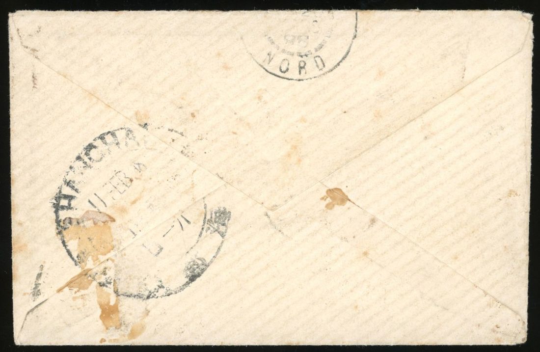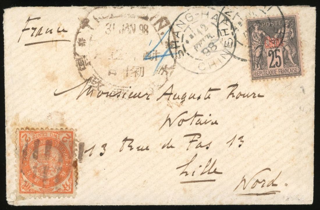 1898 (31 Jan) cover from Tientsin to France, bearing coiling dragon 2c tied by 'pakua' Tientsin in brown with adjacent Tientsin dollar chop '31 Jan 98' routed via the Imperial Post Shanghai with dollar chop on reverse dated '11 Feb 98' and bearing French China 25c tied by 'Shanghai Chine 12 Feb 98' c.d.s. and Nord receiver on reverse. Unique item paying the two cent printed matter rate to Shanghai and then French Post Office to France.