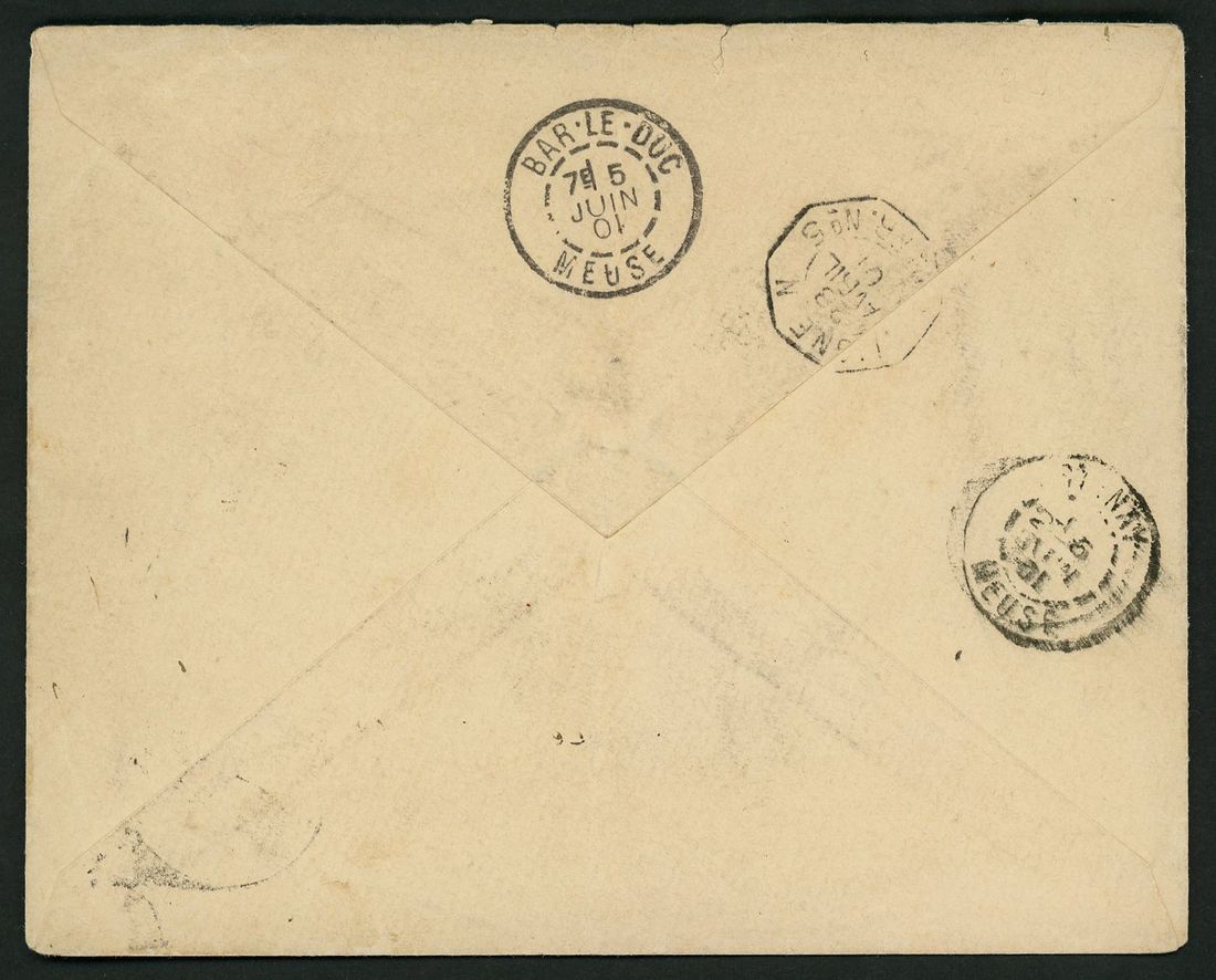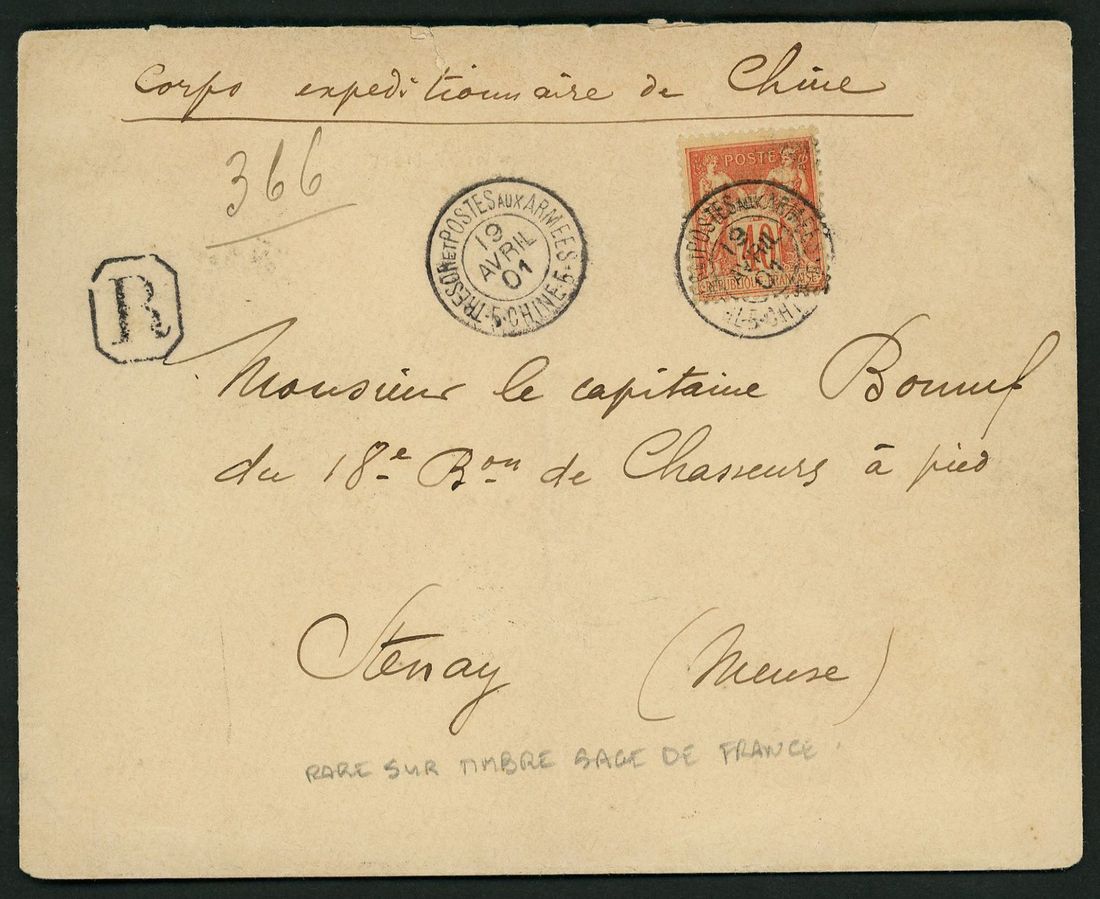 1901 registered envelope to France bearing French 40c tied by 'Tresor et Postes aux Armees 5 Chine 5 19 Avril 01' c.d.s. with framed hand-struck 'R' sent by French paquebot and 'Bar-Le-Duc arrival 5th Juin'. Good item of registered mail.