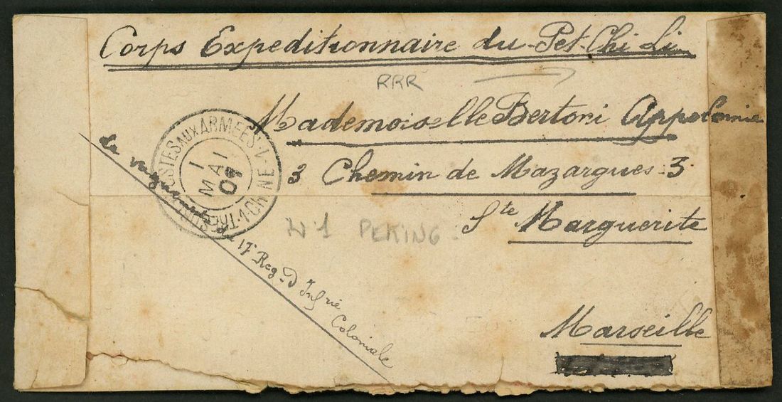 1901 stampless cover to France cancelled by 'Tresor et Postes Aux Armees/1 Chine 1' c.d.s. with 'Corps Exp. Tonkin Ligne Paq.No 2'and with Marseille arrival on reverse.
