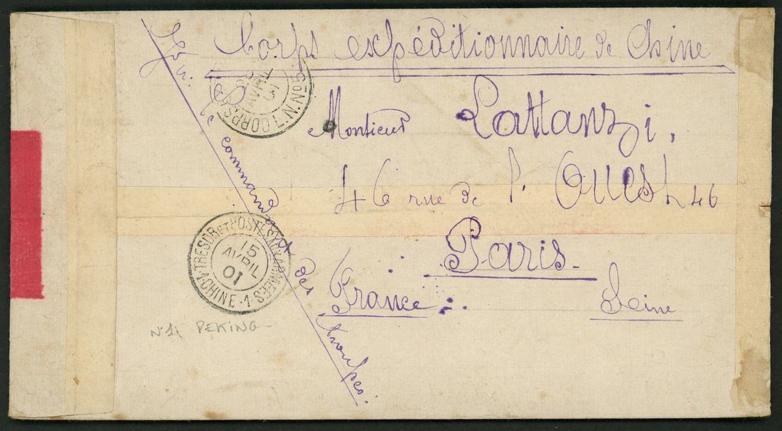 1901 stampless red band envelope to France cancelled by 'Tresor et Postes Aux Armees 1 Chine 15 Avril 01' c.d.s. with 'Corps Exp. L.N. No5 26 Avril 01' c.d.s. Nice item from the French Detachment in Peking during the Boxer Campaign.