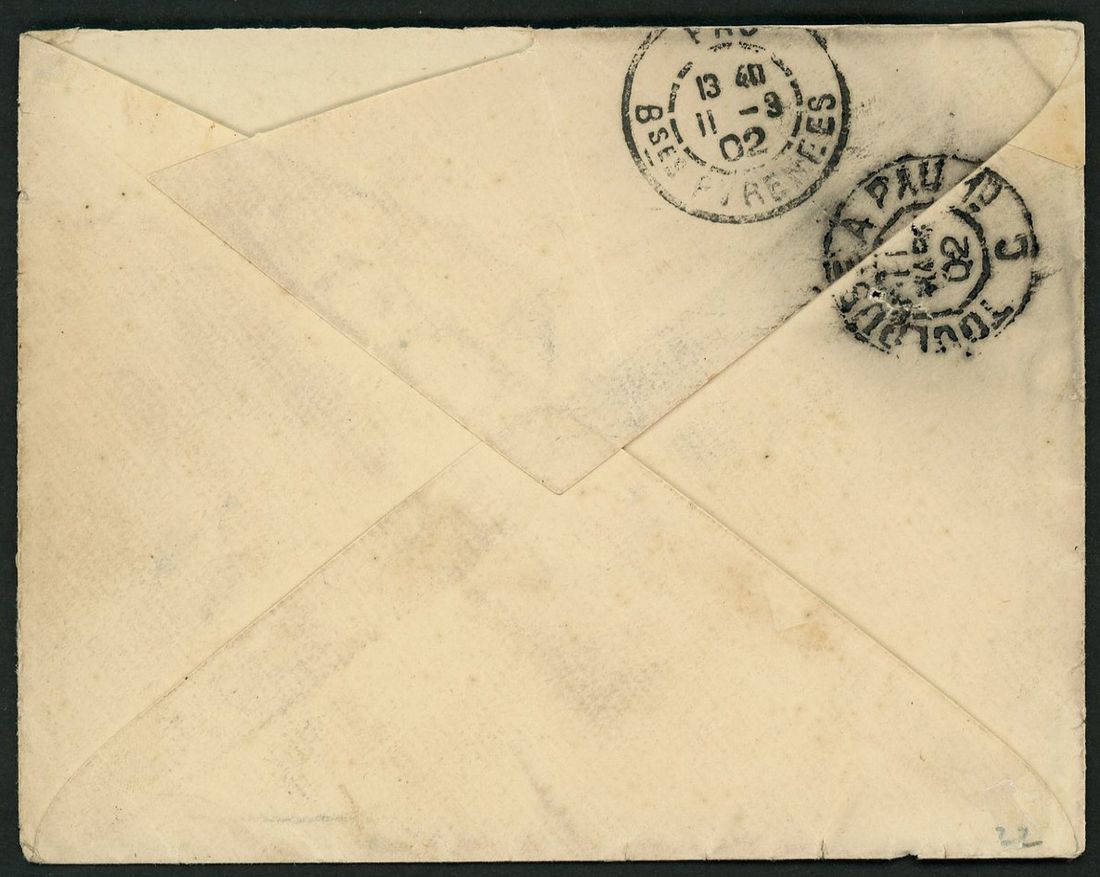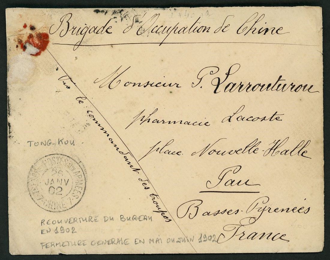 1902 stampless envelope to France cancelled by 'Tresor et Posres Aux Armees 7 Chine 7' date stamp '26 Jan 02' with Pau arrival '11 Mar 02' on reverse. Fine.