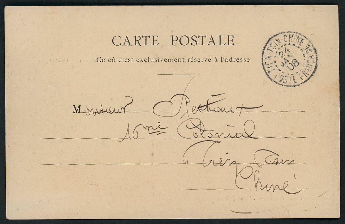 1908 picture postcard to Tien Tsin bearing Fench China 2cts on 5 cts tied by 'Tien-Tsin- Chine/Poste Francaise' arrival double ring.Fine.