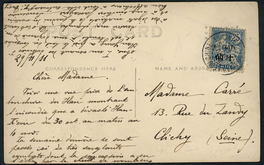1911 picture postcard to France bearing French China 10c on 25c tied by 'Hankeou Chine Poste Francaise' c.d.s.,fine.