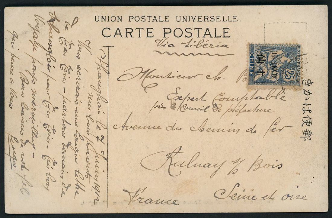 1912 picture postcard addressed to France bearing 10cts on 25cts tied by Shanghai double ring c.d.s.