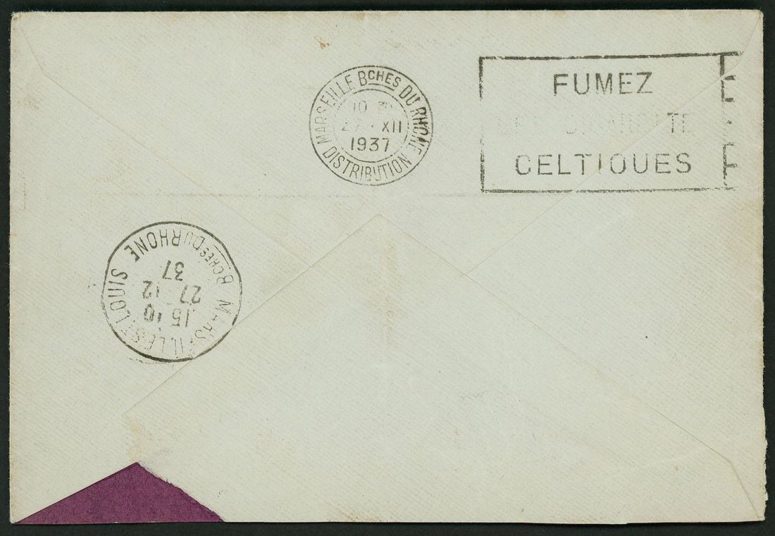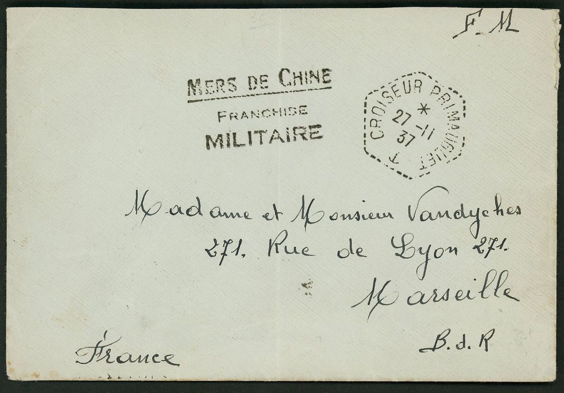 1937 stampless envelope to France written from the French cruiser 'Primauguet' date '27 Nov 37' with bold hand-stamp 'Mers De Chine Franchise Militaire' on face and Marseille arrival on reverse date '27 Dec 37'. The 'Primauguet' was one of the first cruisers built for the French Navy after WW1 in 1924 and served in the south China seas.