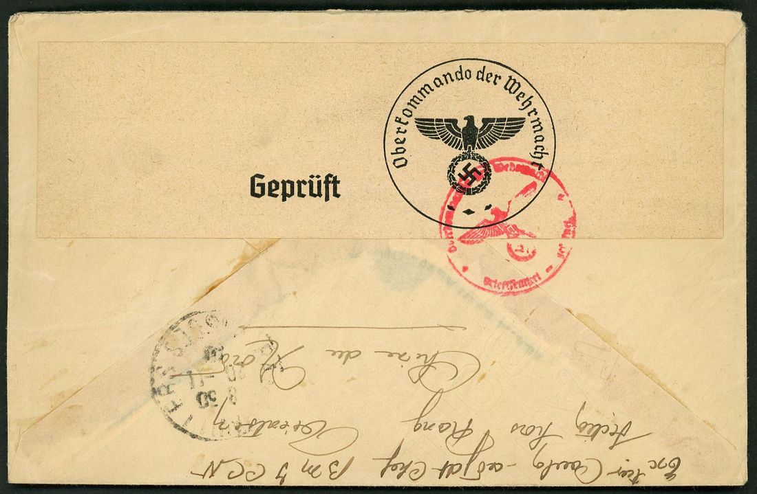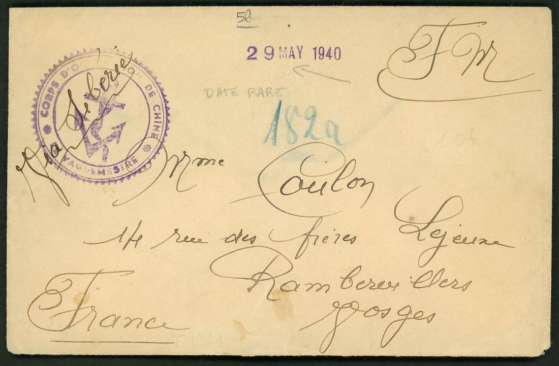 1940 stampless envelope to France cancelled by circular 'Corps D' Occupation De Chine Le Vaguemestre' and dated hand-stamp '29 May 1940' in violet on face with 'Gepruft' German censor lable tied by circular censor cachet in red and Vosges arrival '20 Nov 40' on reverse.Fine.
