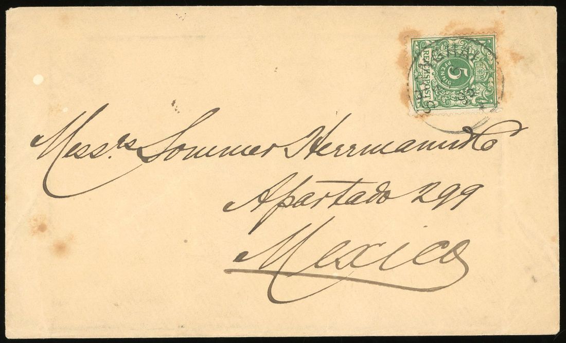 1895 (31 May) printed matter cover from Shanghai to Mexico bearing German 5pf. tied by German PO Shanghai c.d.s., on reverse Paso del Norte transit (13 July) and El Paso arrival (14 July), rare printed matter rate usage to Mexico. Photo