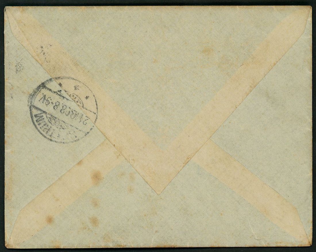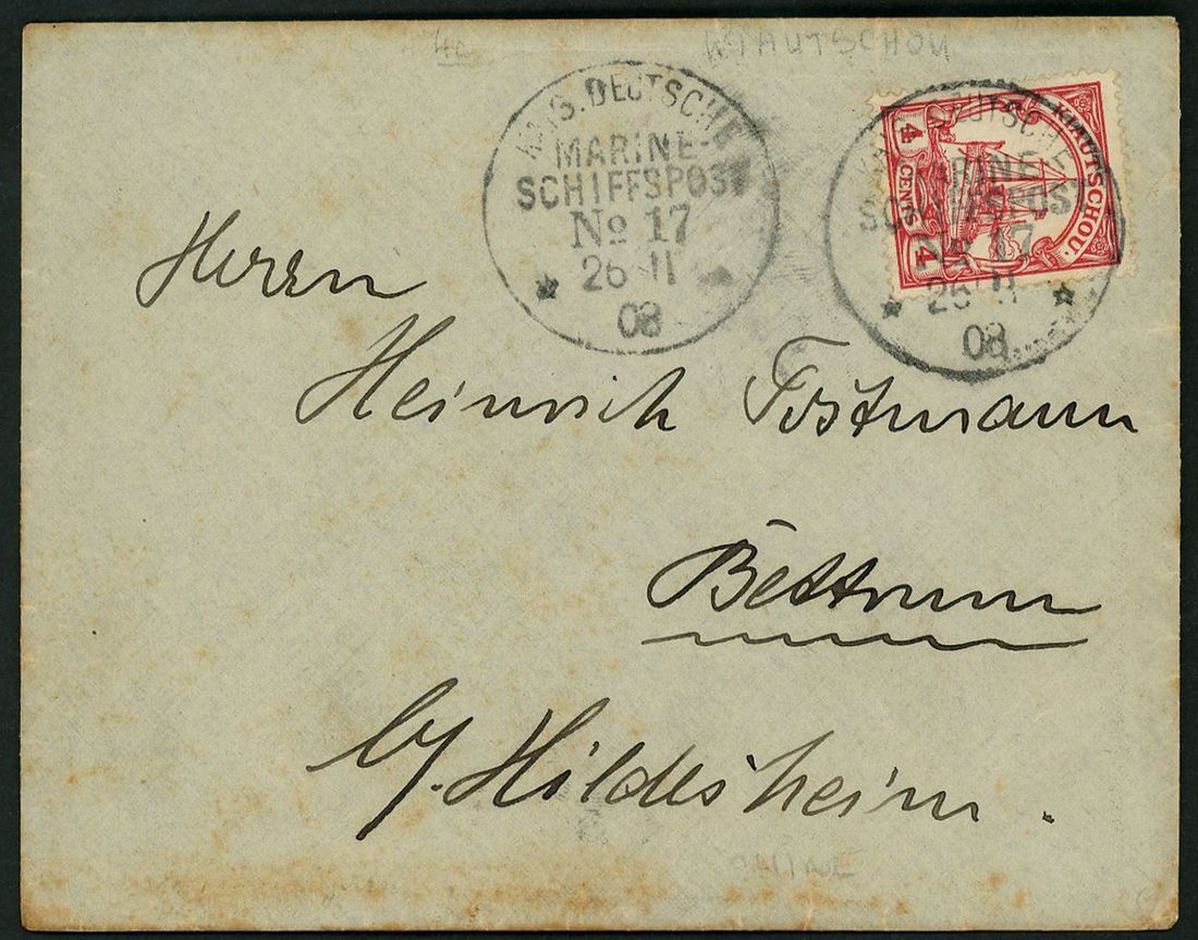 1908 (26 Nov) envelope addressed to Germany bearing Kiautschou 4c cancelled by 'Kais. Deutsche Marine Schiffspost No 17 26 11 08'.and arrival c.d.s. on back.Very nice item of maritime mail from Kiautschou.