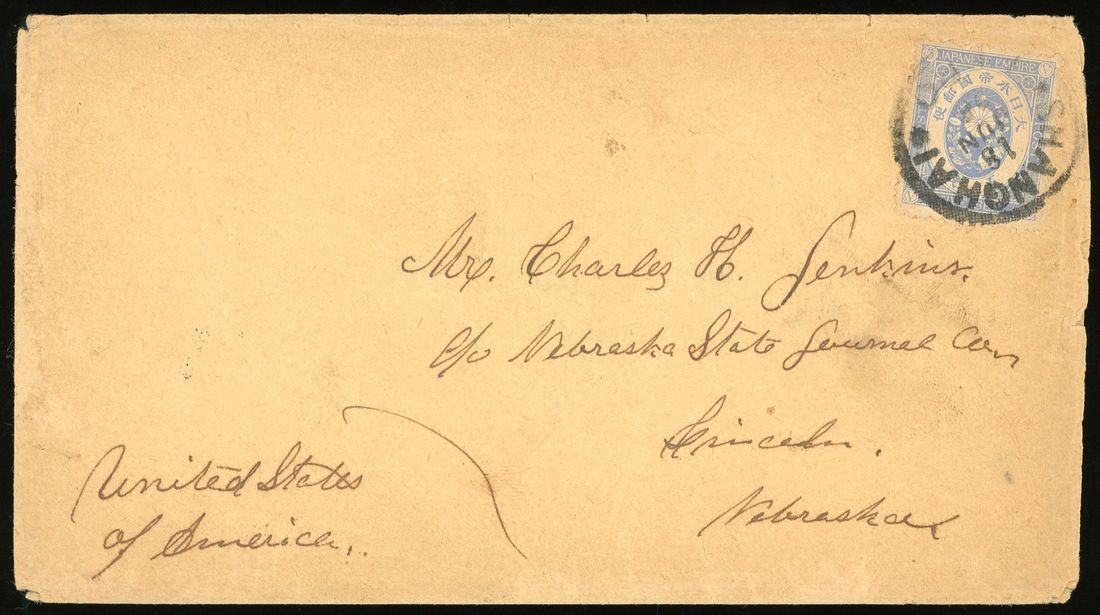 1896 (18 June) cover from Shanghai to USA bearing Japan 5s tied Japan Shanghai c.d.s., on reverse Yokohama (18 June) and San Francisco (5 July) transits, Lincoln arrival (8 July). Photo