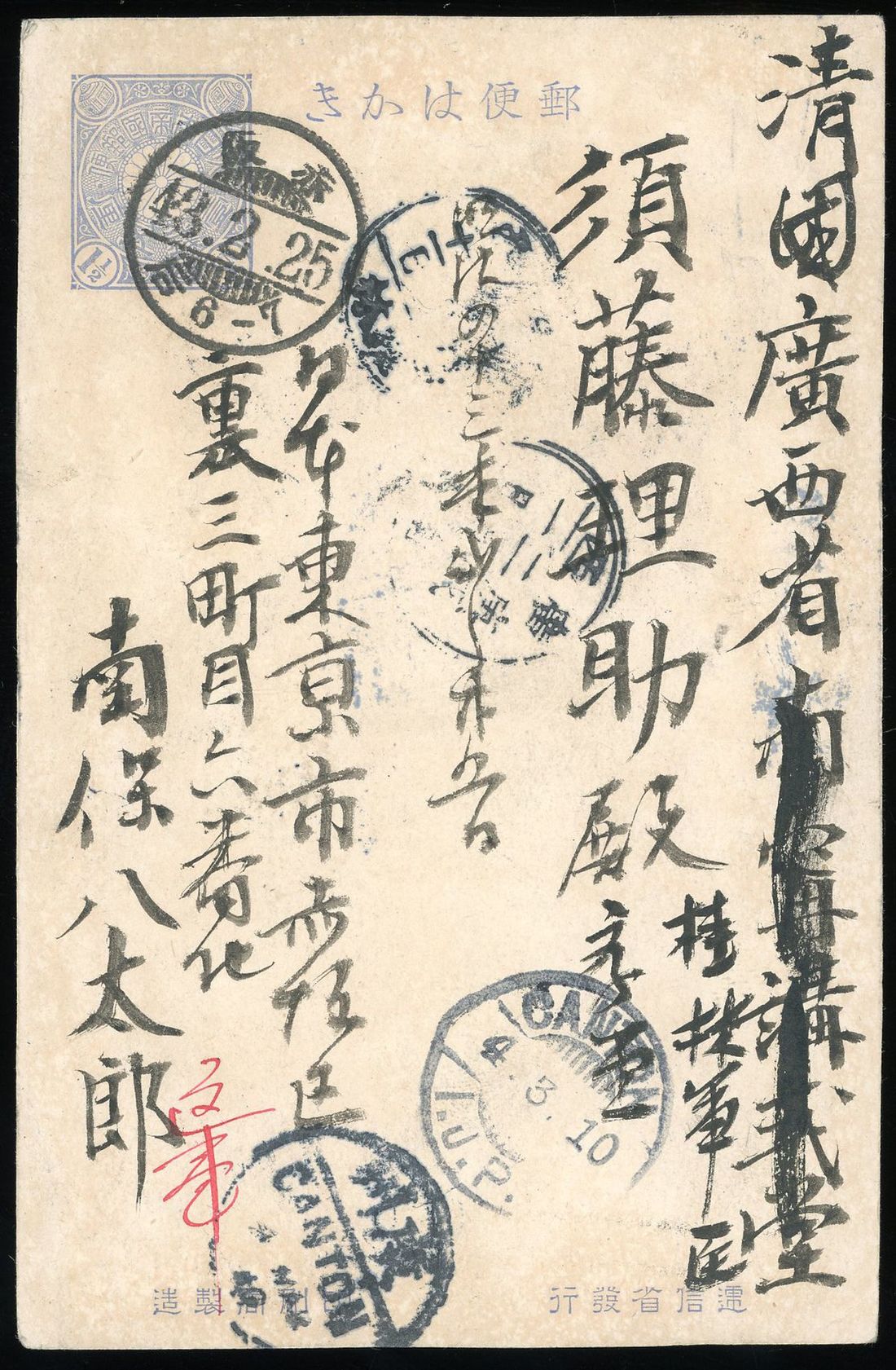 1910 (25 Feb) Japan postal stationery 1 1/2 tied by Akasaka c.d.s. to Kweilin routed via Canton with 'Canton I.J.P.O. 4 Mar.10' c.d.s. and Kweilin arrival c.d.s. Fine.
