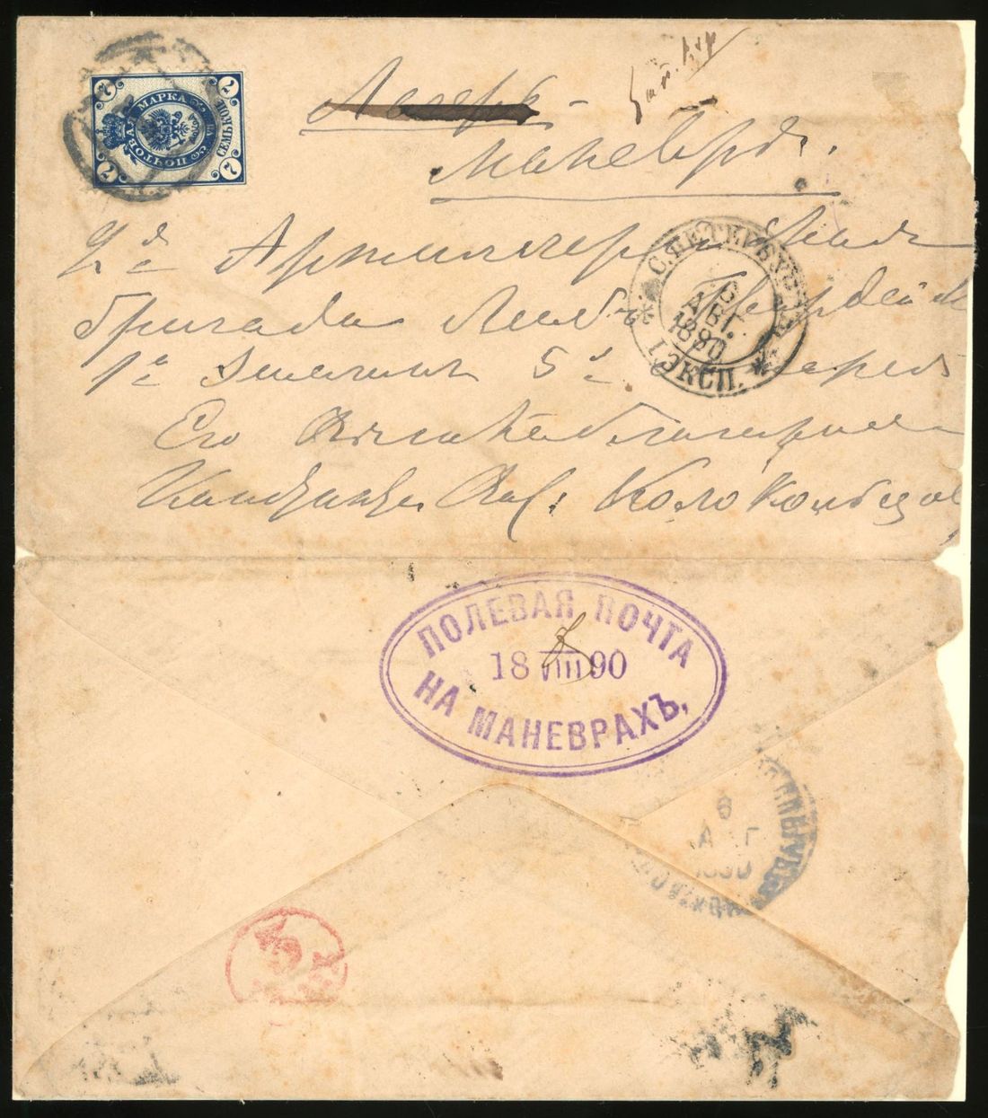 1890 (Aug.) Russian military cover, f.w. Coat of Arms 7k, tied by circular obliterator, matching with oval military d.s. on the reverse. Transit St. Petersbury.