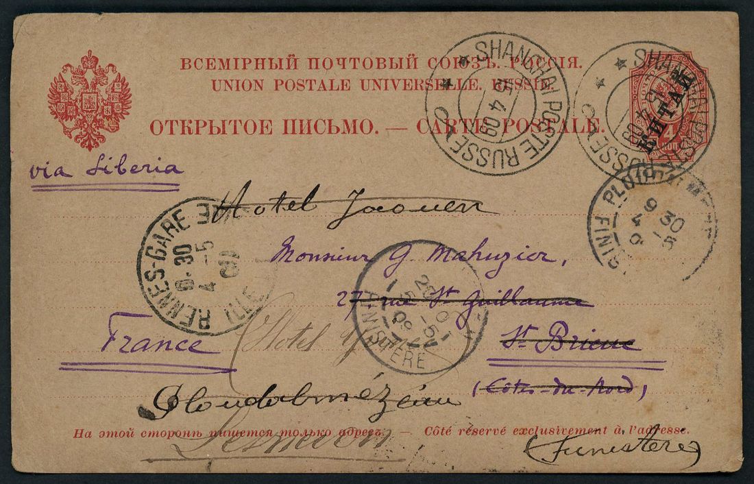 1909 (15 Apr) Russian postal stationery card 4k cancelled by 'Shanghai Poste Russe' addressed to France with St Brieux arrival and forwarded to Rennes.Very fine.