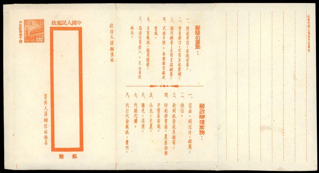 1950 Tian An Men $5,000 red-orange letter sheet unused, type 3 advertisement at back. Padget NE7 (3). DJ3-3. Photo