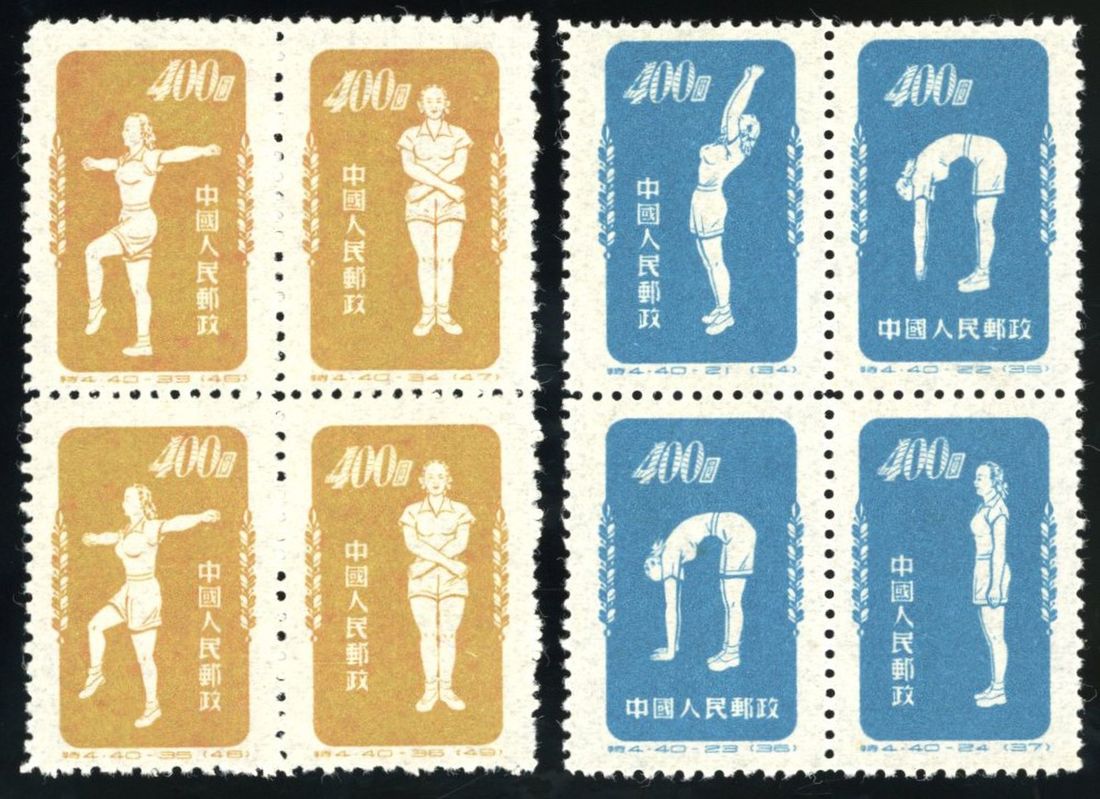 1950 S-4 Gymnastics original print in blocks of four, very fine.