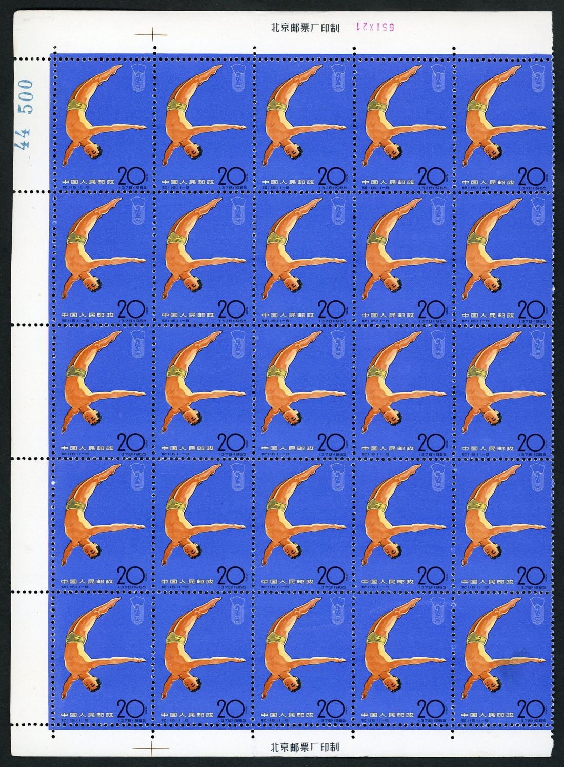 1965 (28Sep) C116 National Games. (2nd Series) 20f. Diving in half sheet of 25. One stamp thinned and some stamps with stains on gum side.Unmounted mint.