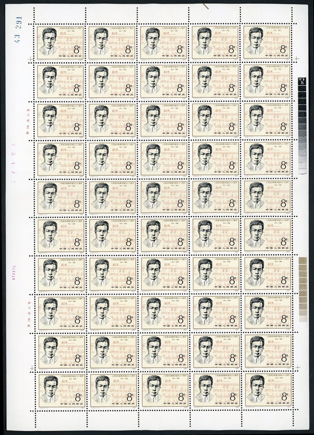 1982 (15 Feb.) J75 70th Anniv. of the Birth of the People's Musician, 8f. 130 full sheets of complete sheet of 50, unmounted mint, lightly toning.
