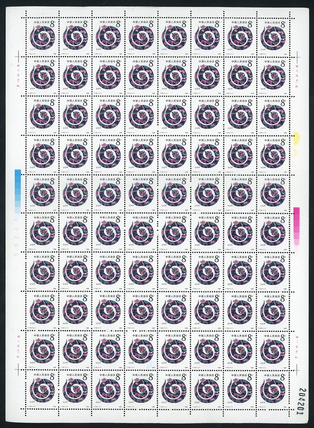 1989 (5 Jan.) T133 Year of Snake (Jisi Year) 8f., a hundred sheets of complete sheetof eighty, unmounted mint, lightly toning.