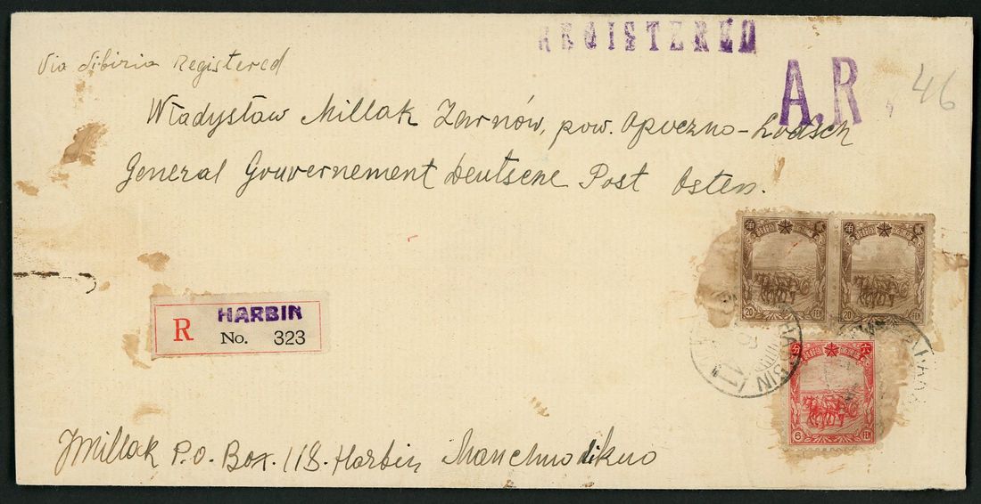 1941 registered cover to the 'German Government in Poland' bearing Manchuria 6f and 20f in pair tied by 'Harbin' c.d.s. with Harbin registration label and hand stamp 'Registered' and 'A.R' in violet. Fine.