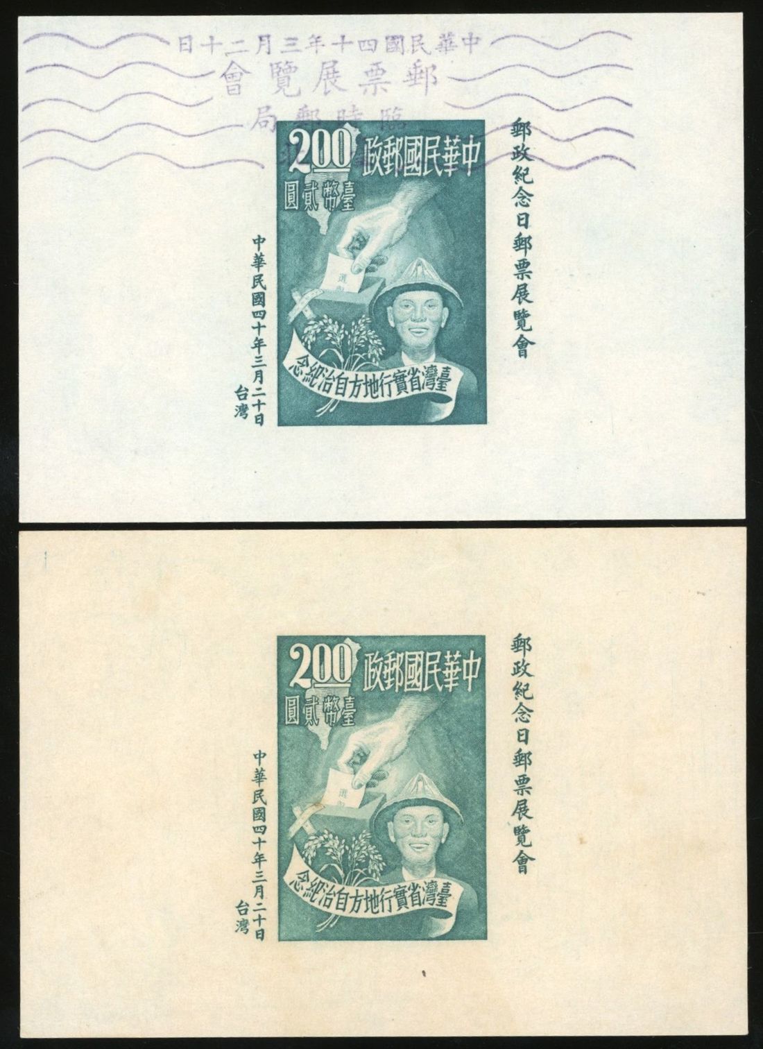 1951 (20 Mar) 4 th Postal Day Stamp Exhibition Souvenir unused without gum and toning. One with cancellation.Fine.