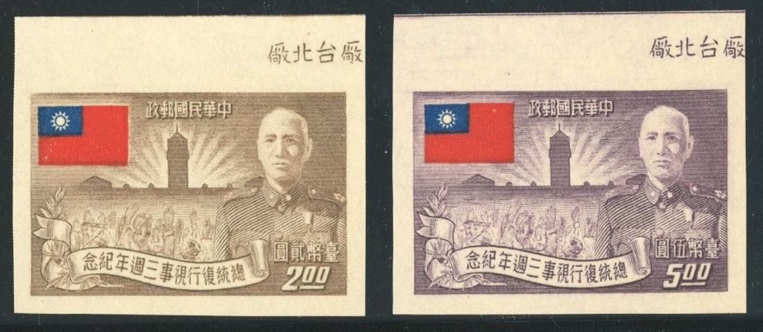 1953 (1 Oct) Third Anniv. of Re-election of President Chiang Kai-shek 10c. to $5, imperf set of six with upper imprint margin.Very fine.