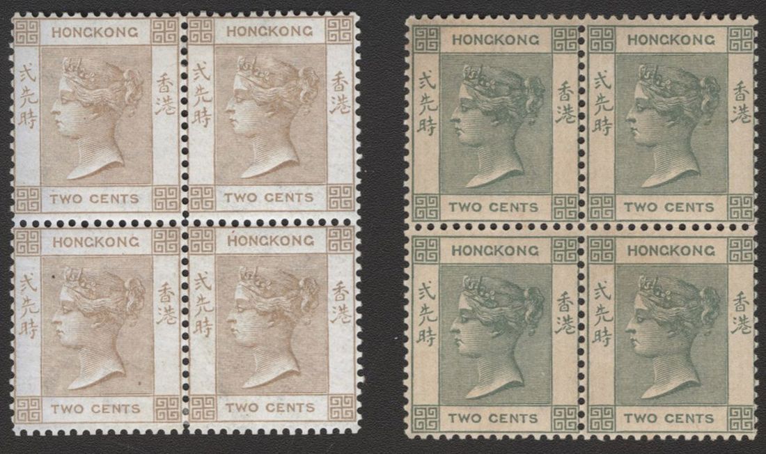 1863-74 wmk CC 2c. brown block of four, mint with original gum, another 1900 wmk CA 2c. dull green block of four, mint, toning. Yang 8a, 55
