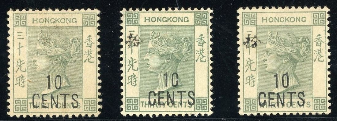 1898 10c on 30c grey-green mint with original gum hinged and two with addition Chinese character by handstamp on the left panel, fine.Yang 53,54