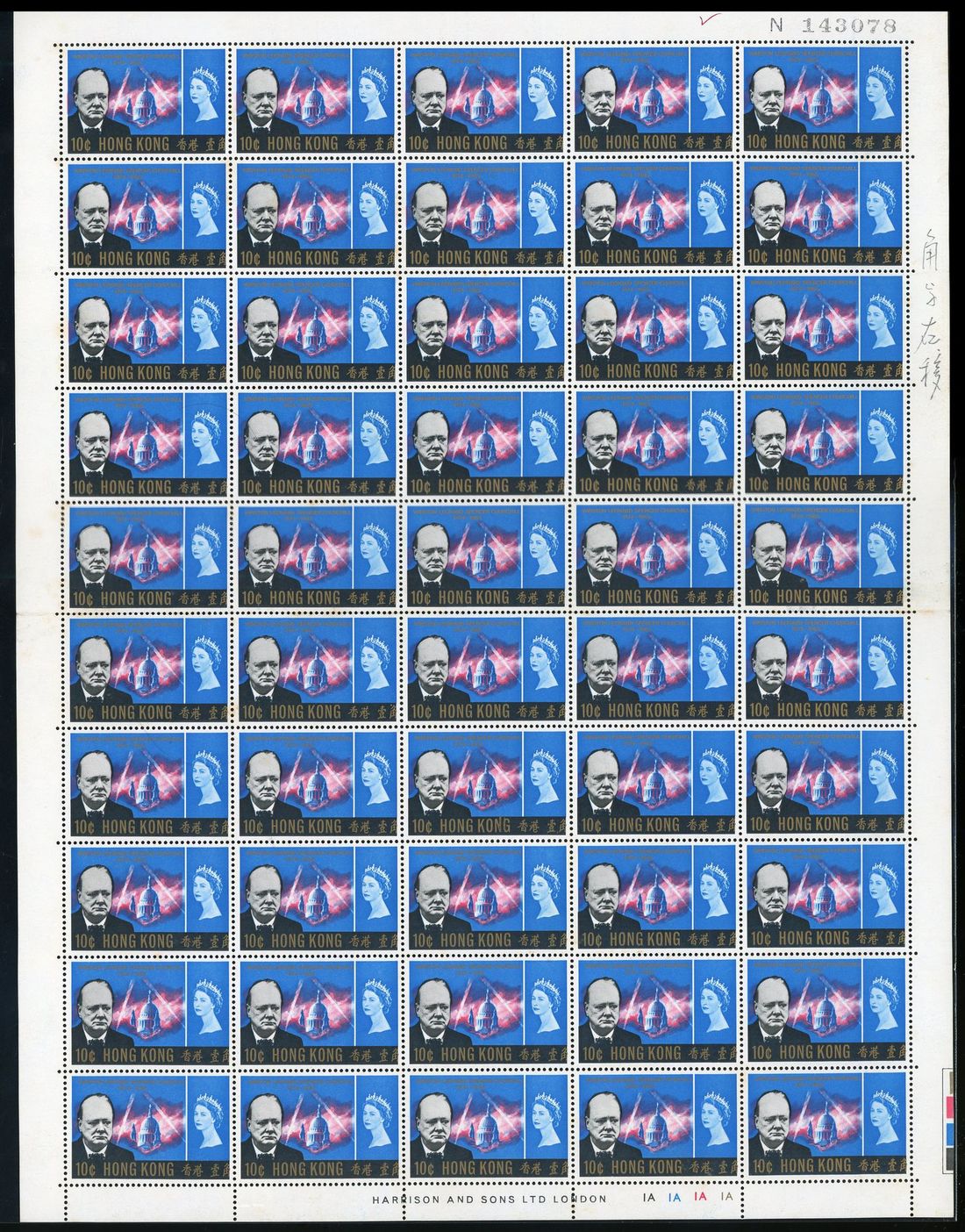 1966 (24 Jan) Churchill Commemoration. 10c full sheet of 50, showing the Chinese chracter ten cents shifted to right variety.